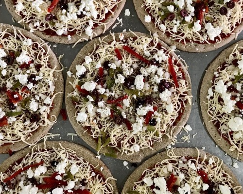 Πίτσα Ελληνική με αλεύρι Ζέας, φέτα, πιπεριες, ελιες, ελαιολαδο & ριγανη